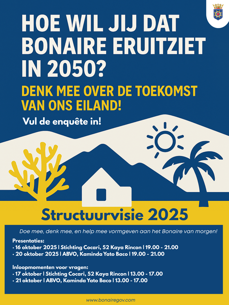 Het Openbaar Lichaam Bonaire (OLB) start met de ontwikkeling van de Structuurvisie Bonaire 2050: een toekomstplan waarin we samen bepalen hoe ons eiland zich op een duurzame, evenwichtige en mooie manier kan blijven ontwikkelen. Iedere Bonairiaan wordt uitgenodigd om mee te denken over hoe Bonaire er in 2050 uit moet zien. Via een korte enquête van slechts tien vragen kan iedereen zijn of haar mening geven over belangrijke thema’s zoals wonen, natuur, verkeer, voorzieningen, klimaat en toerisme. De enquête is te vinden via deze link.