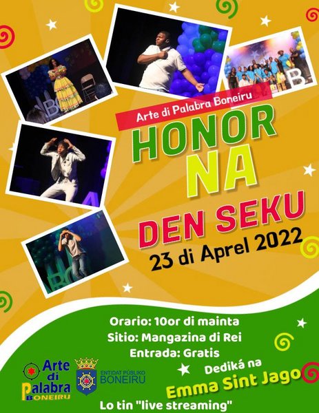 Pueblo di Bonaire ta invitá pa disfrutá di e obranan di Arte di Palabra Bonaire durante e kompetensia djasabra awor 23 aprel 2022 kual ta inisiá 10’or di mainta na Mangazina di Rei. Entrada pa un i tur ta grátis. Tambe tin e posibilidat pa sigui e kompetensia virtual via Nostv i via página di “facebook’’ di Arte di Palabra Boneiru.