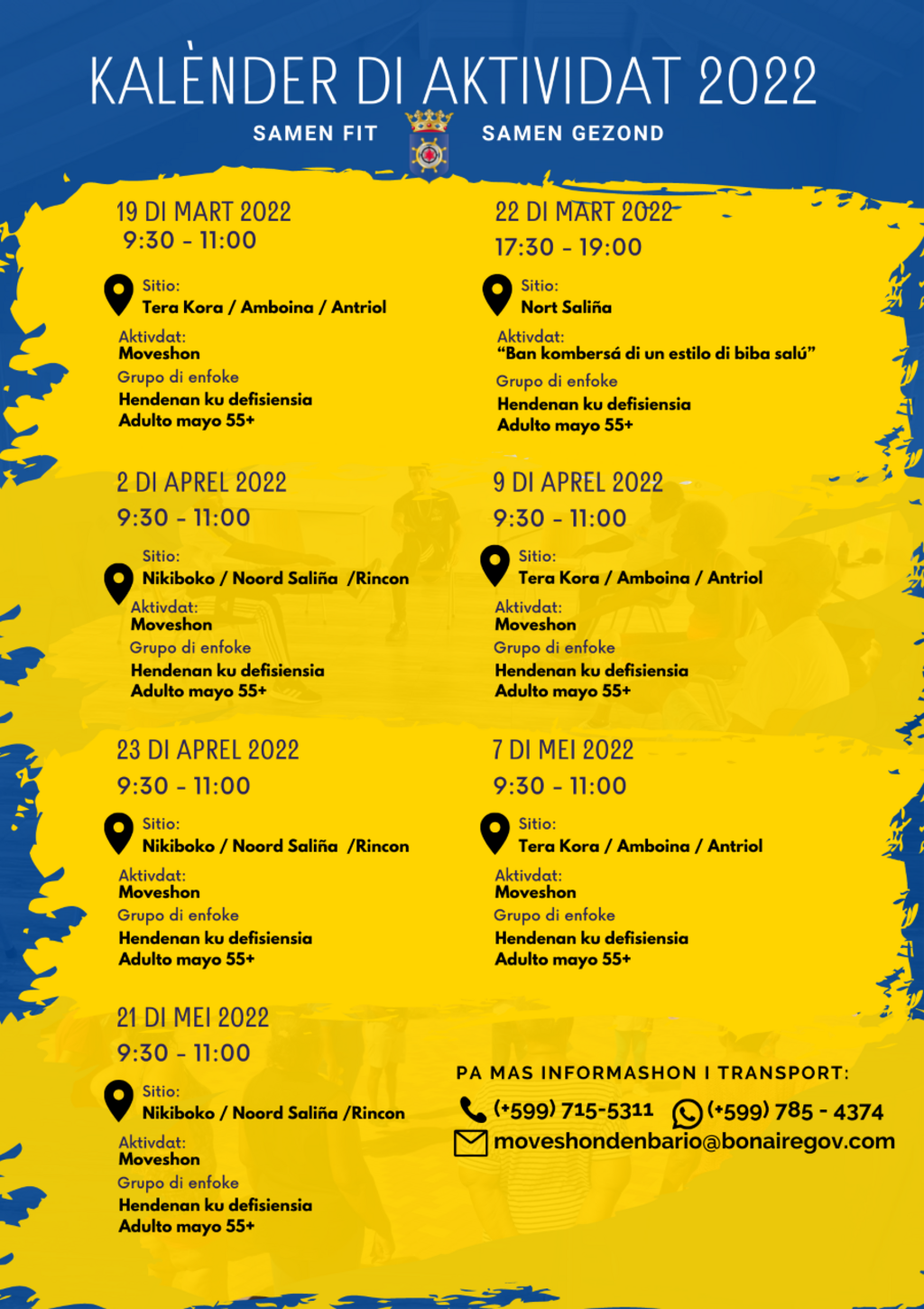 Pa mas informashon òf pregunta relashoná ku e aktividatnan bo por tuma kontakto ku Direktorado di Komunidat i Kuido, sra Sharifa Sedney na 715 – 5311 òf 785 – 4374, òf manda un email na moveshondenbario@bonairegov.com