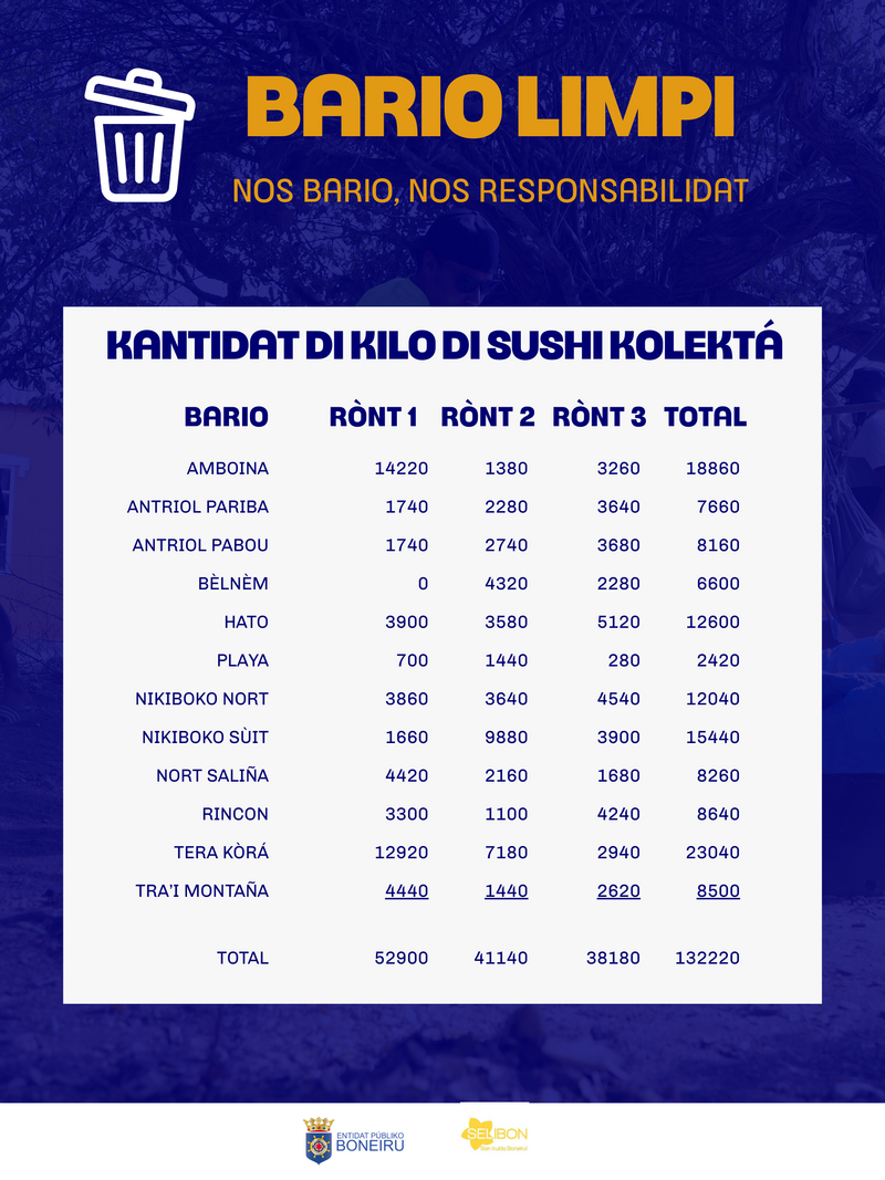 E kampaña Bario Limpi a terminá eksitosamente. Durante tres wikènt di akshon den e promé tres simannan di desèmber a kolektá en total 132 tòn di sushi den diferente bario na Boneiru. E último rònt di akshon a tuma lugá for di 19 te ku 21 di desèmber, kaminda a kolektá otro 38 tòn di sushi.