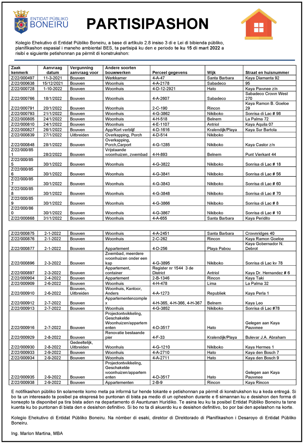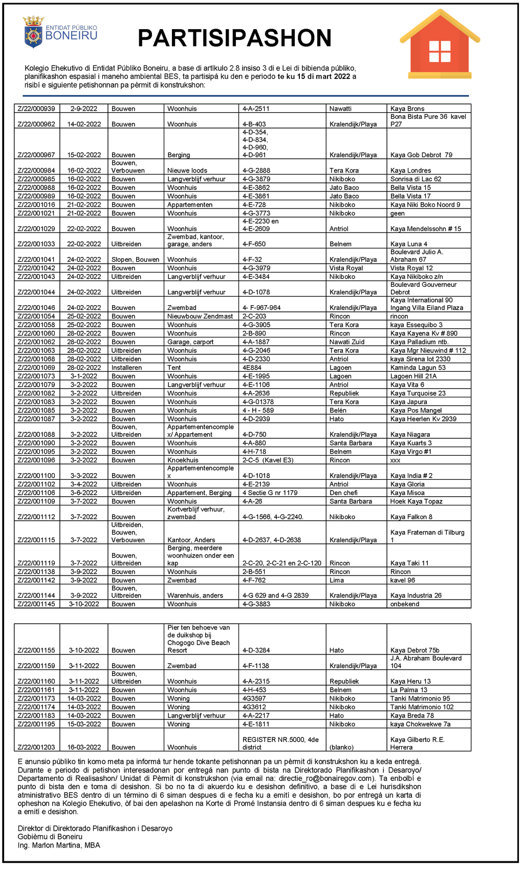 Kolegio Ehekutivo di Entidat Públiko Boneiru, a base di artíkulo 2.8 insiso 3 di e Lei di bibienda públiko, planifikashon espasial i maneho ambiental BES, ta partisipá ku den e periodo te ku 15 di mart 2022 a risibí e siguiente petishonnan pa pèrmit di konstrukshon: