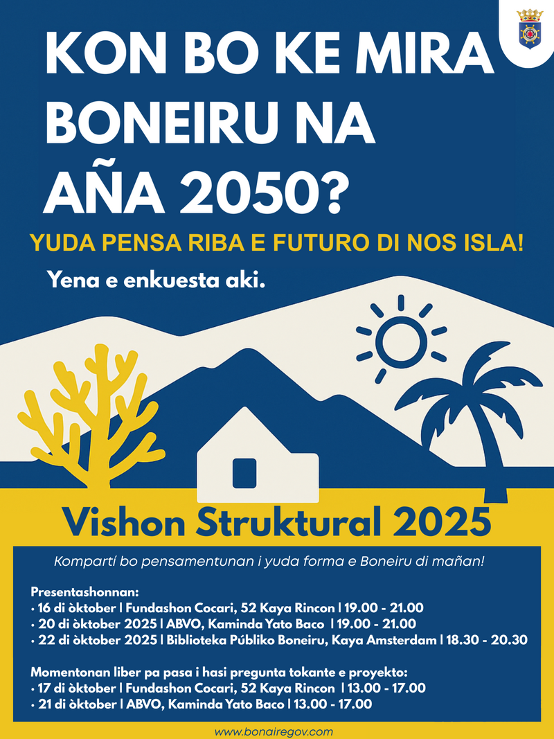 Entidat Públiko Boneiru ta ranka sali ku desaroyo di e ‘Structuurvisie Boneiru 2025’ (Vishon Struktural 2025): un plan pa futuro den kua huntu nos ta determiná kon nos isla por sigui desaroyá su mes na un manera sostenibel, ekilibrá i bunita. Nos ta invitá kada boneriano pa yuda pensa tokante kon Boneiru mester lusi na aña 2050. Pa medio di un enkuesta kòrtiku di solamente 10 pregunta, tur hende por duna nan opinion tokante temanan importante manera biba, naturalesa, tráfiko, fasilidatnan, klima i turismo. Por haña e enkuesta via e lenk aki.