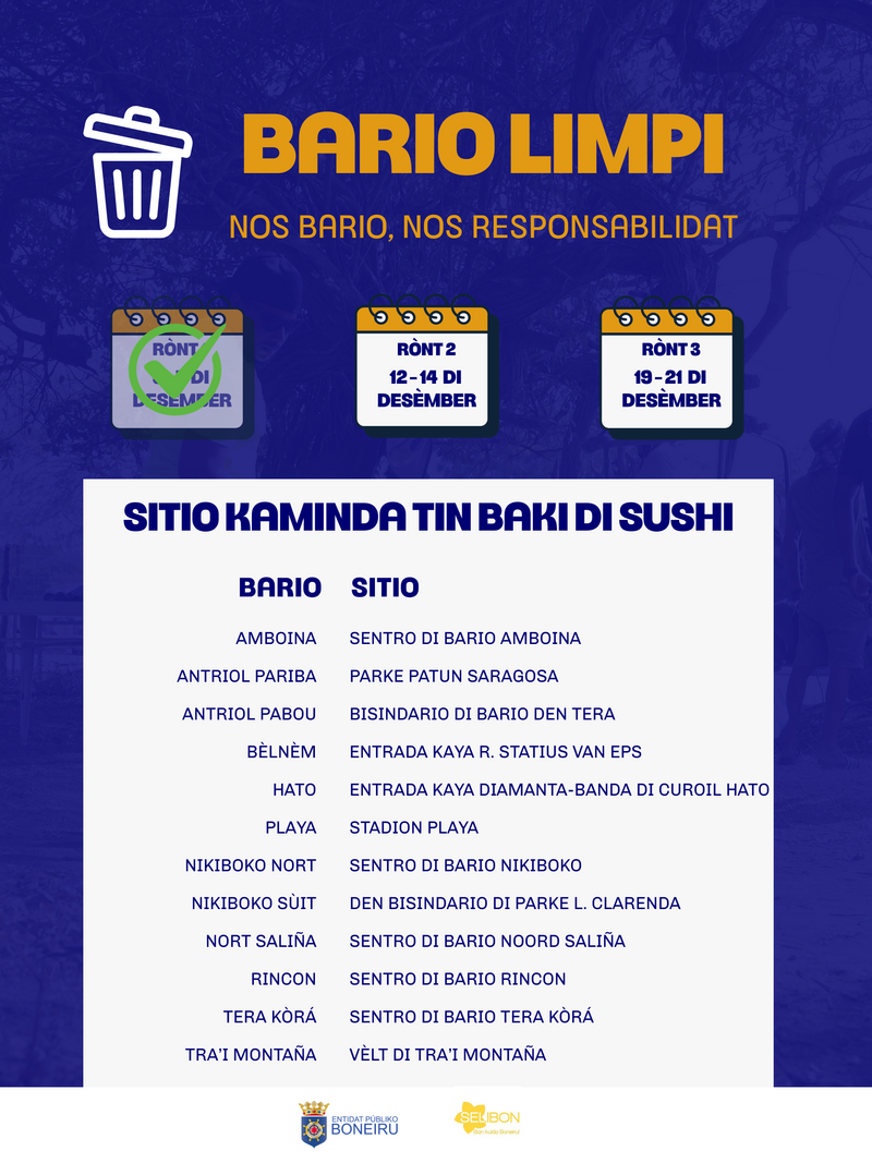 Entidat Públiko Boneiru i Selibon ta gradisí tur habitante pa nan partisipashon na e promé wikènt di e kampaña di Bario Limpi. For di 5 te ku 8 di desèmber a pone baki grandi di sushi den diferente bario i hendenan a hasi bon uso di esaki. En total nan a entregá mas ku 52 tòn di sushi.